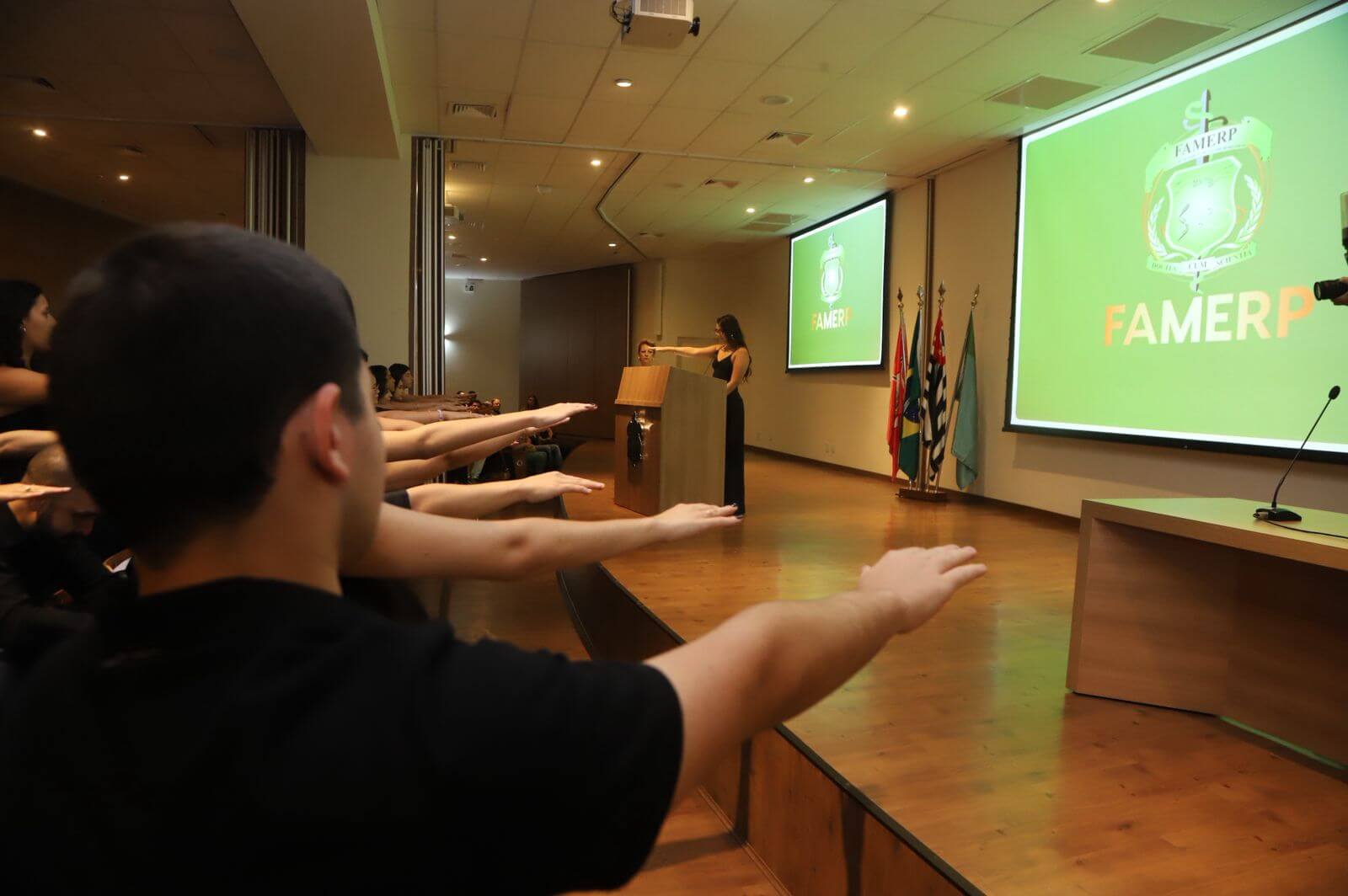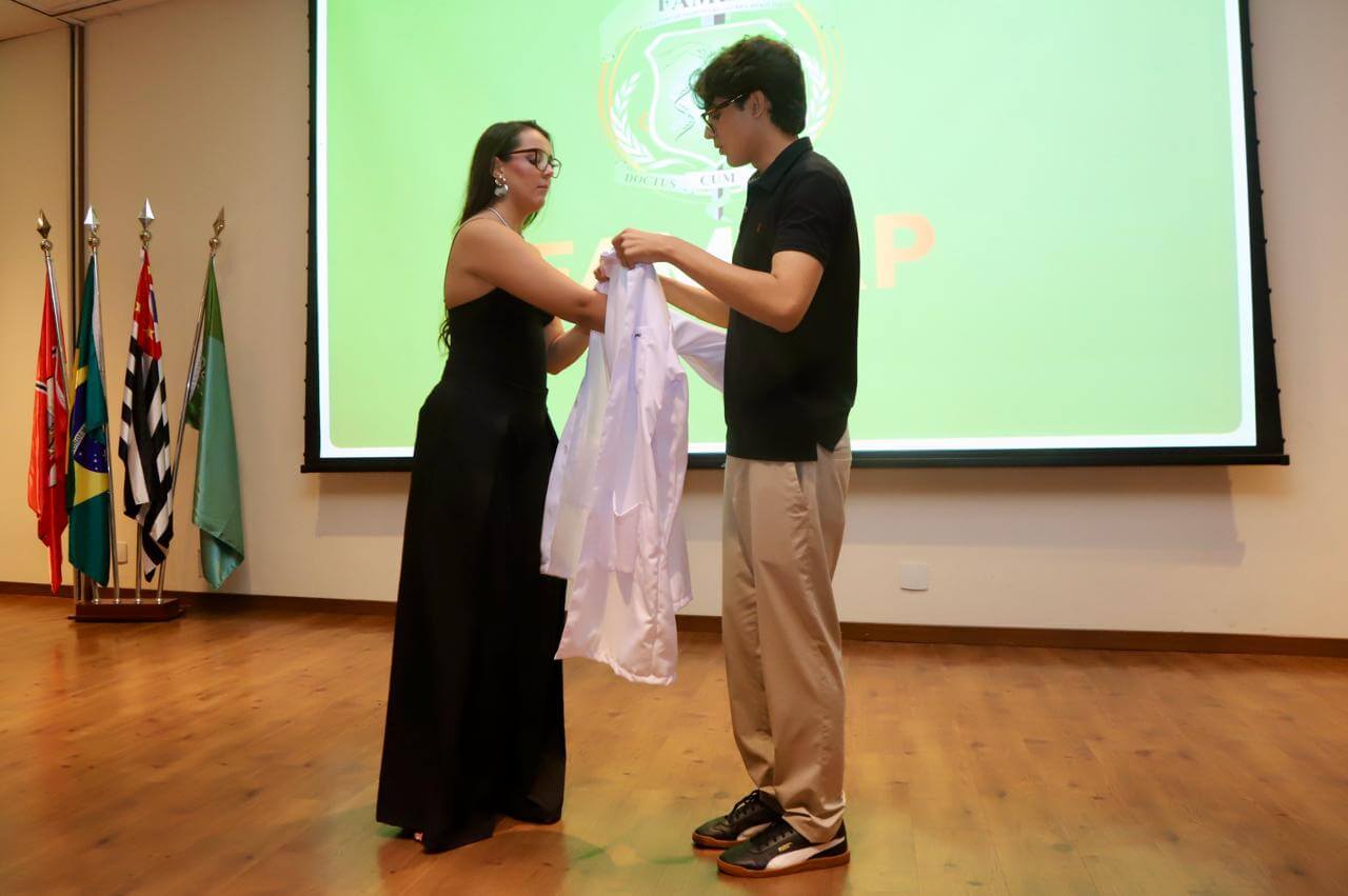 Mais do que a entrega de um uniforme, o ato de vestir o jaleco — primeiro Equipamento de Proteção Individual (EPI) utilizado na área da saúde — simboliza a transição para um novo ciclo, no qual conhecimento técnico, ética e sensibilidade humana passam a caminhar lado a lado. Com o logotipo da FAMERP estampado no braço, os estudantes assumem, desde o primeiro ano, o compromisso de representar a instituição dentro e fora dos espaços acadêmicos, carregando consigo valores que ultrapassam a sala de aula.