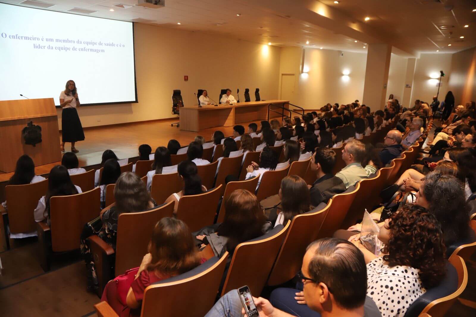 A programação contou ainda com palestra da Profa. Dra. Daniele Alcalá, que abordou temas relacionados à responsabilidade profissional e às perspectivas do mercado de trabalho para o enfermeiro, ampliando o olhar dos ingressantes sobre os desafios e oportunidades da carreira.